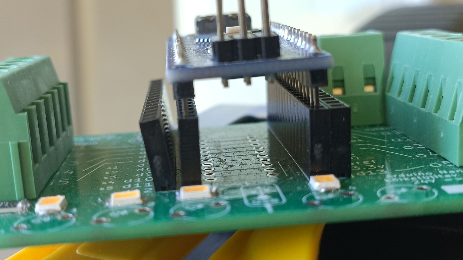 Välimiste klemmliistude paigaldamiseks eemalda mikrokontroller ja paiguta plaat lauale nagu näha alloleval pildil. Kontrolli üle, kas klemmliistud on tihedalt üksteise vastas. |