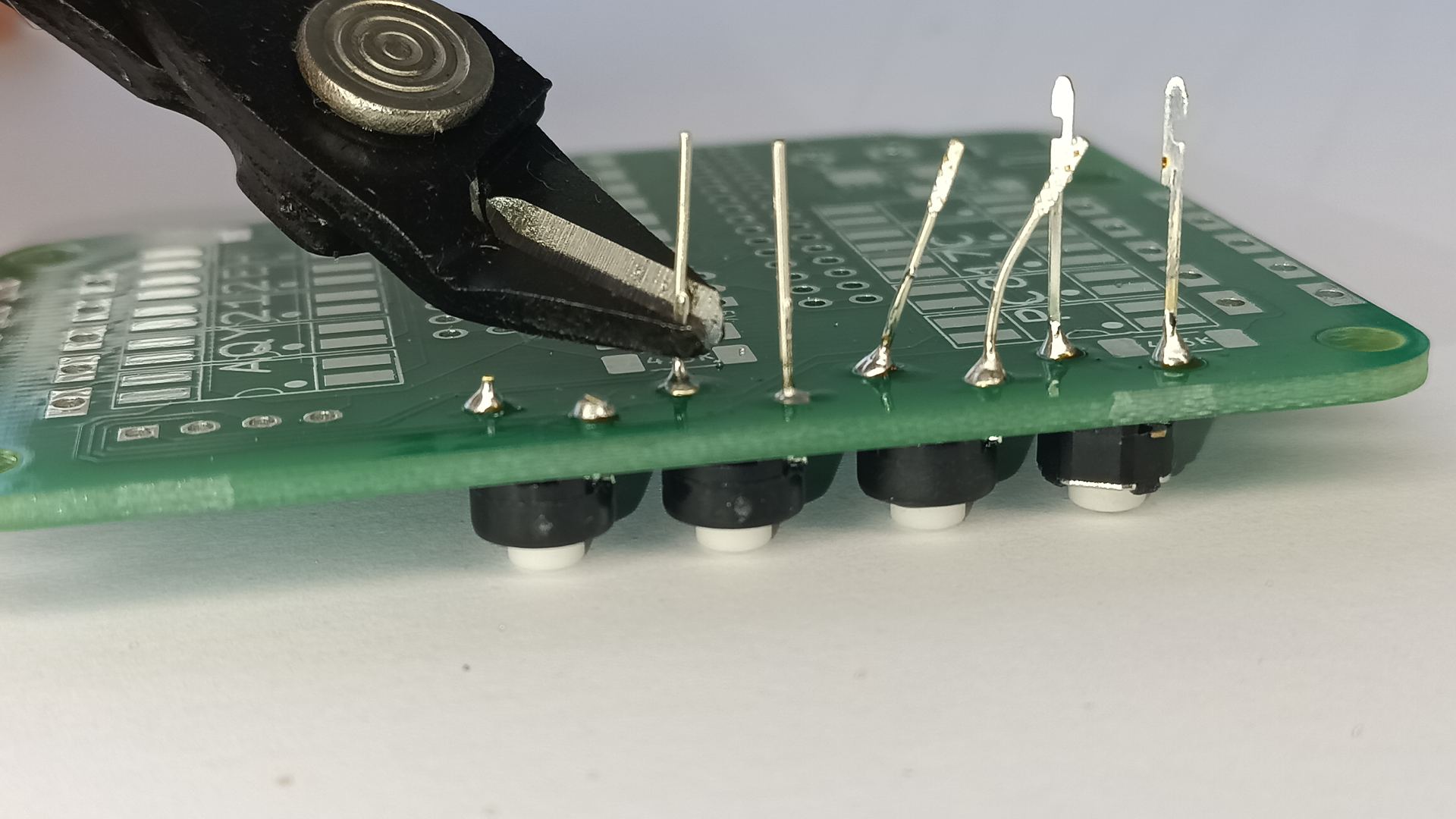 Vedrunuppude puhul torka nende jalad läbi trükiplaadi ja aseta tagurpidi lauale - nii ei kuku nupud välja ja jootekolviga jalaaugu servale vajutades surud plaadi samal ajal ka vastu nuppu. |