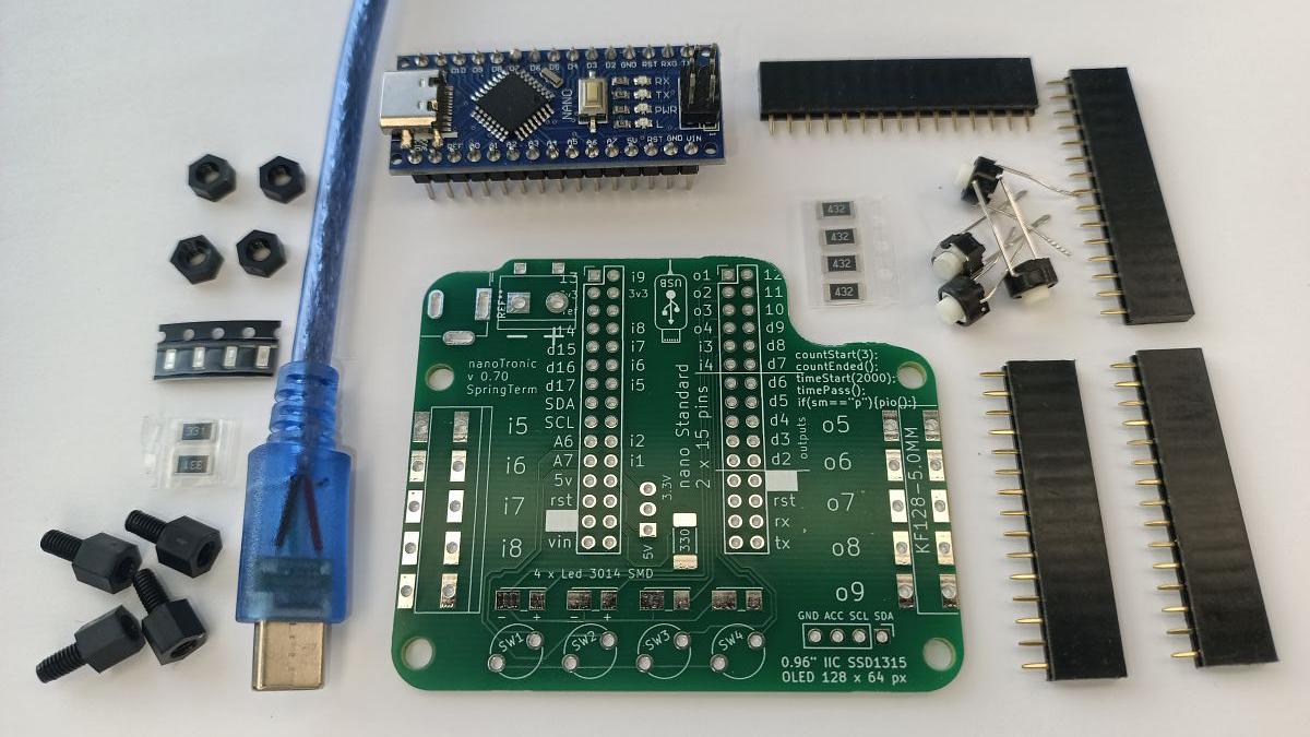 Esimese montaa¾ietapi komponendid koos 0.70 versiooni trükiplaadi, Arduino nano kontrolleri ja USB Tüüp-C andmejuhtmega on nähtavad paremal oleval illustratsioonil